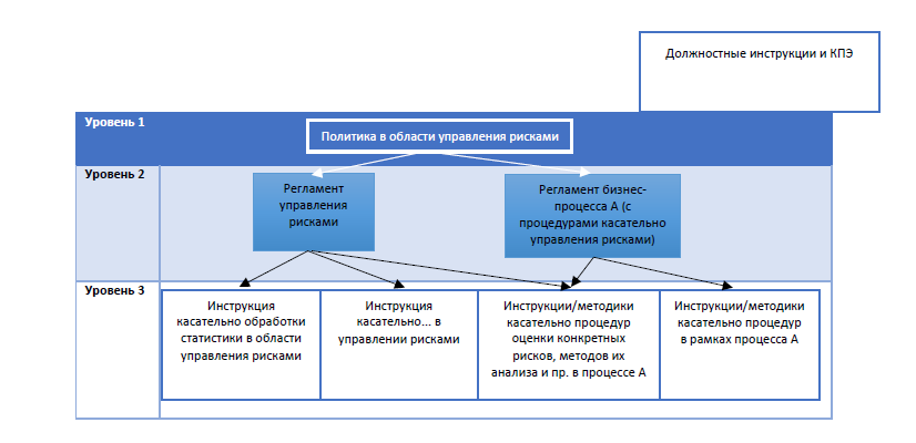 На взгляд практика, более предпочтительным является второй вариант, поскольку он гарантирует неотделимость риск-менеджмента от других бизнес-процессов и гармоничную взаимосвязь шагов по управлению рисками с основными этапами реализации соответствующего процесса. При этом в дополнение к основным регламентам вполне возможно выделить следующий (третий) уровень регламентирующей документации, например, подробные инструкции/методики по исполнению сложных процедур управления рисками, особых методик количественного моделирования, оценки или специальных исследований, как для облегчения нормативной документации, так и для случаев, когда к исполнению соответствующих шагов будут иметь отношение не все участники основного бизнес-процесса.